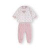 Conjunto de jersey, polaina y capota, en tostado con detalles en rosa. Composición: 50% algodón y 50% acrílico. Lavable a máquina máx. 30ºC. No usar lejía. No usar secadora. Planchado suave.
