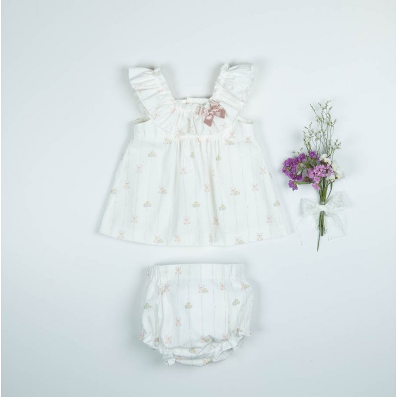 Vestido tipo jesusito, con braguita a juego. Composición: 100% algodón. Lavable a máquina máx. 30ºC. No usar lejía. No usar secadora. Planchado suave.